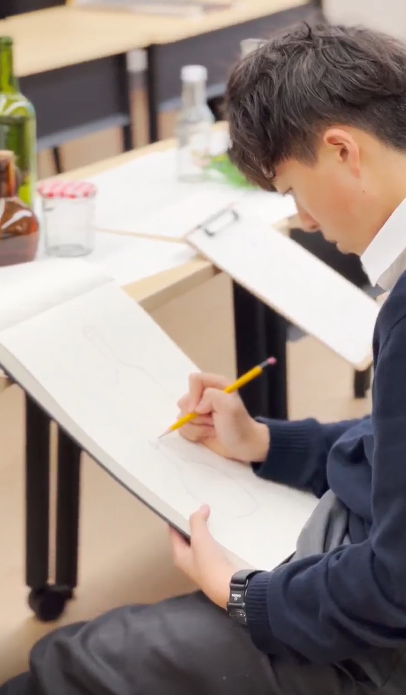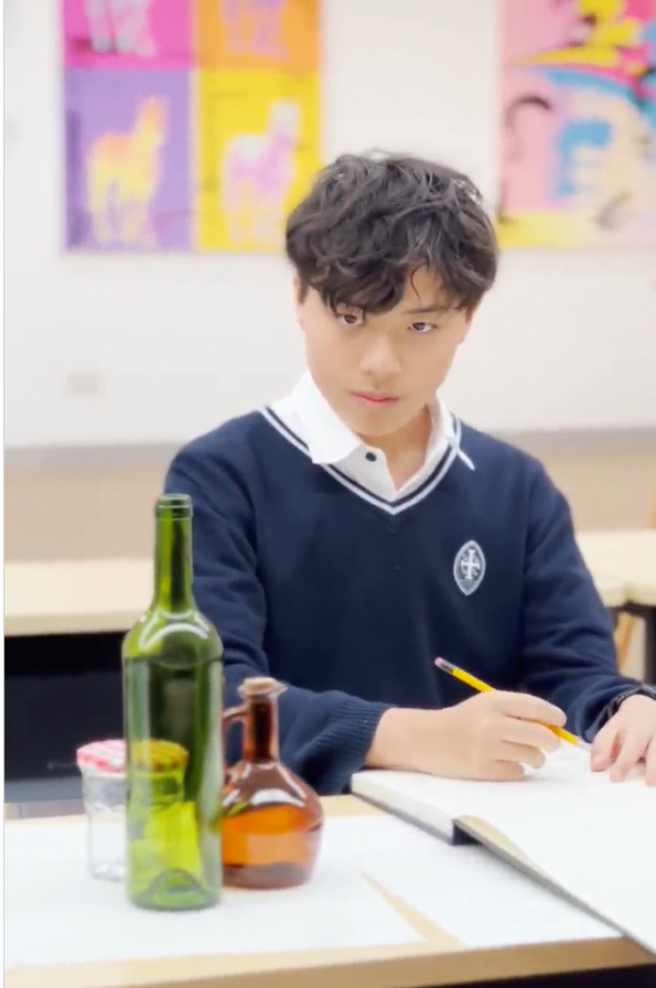 With a still life arrangement before him, Sung Hei begins to draw, applying the techniques he has just explored.